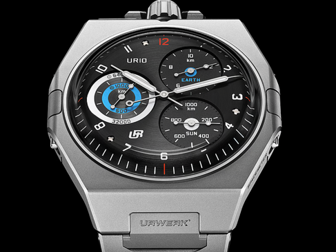 It is at that point when the resemblances to a streamlined sports watch dissipate (observe the elegant integrated band). The Urwerk UR-10 Spacemeter use its lower left subdial not to monitor seconds during a lap around a racecourse, but rather to represent the Earth's revolution around the Sun, with one complete turn for every 1,000 kilometres.